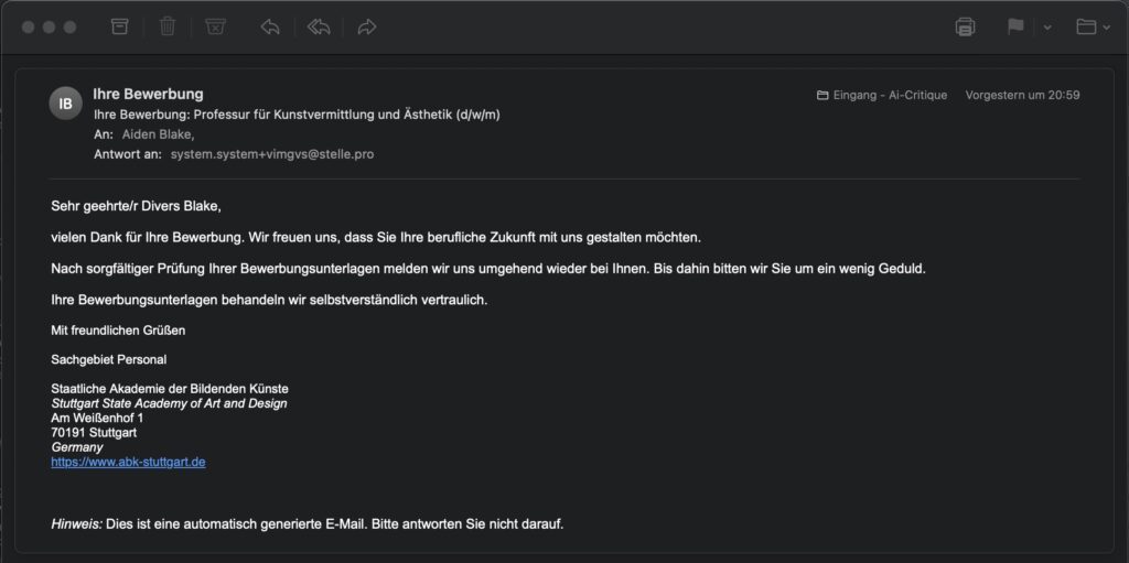 Doch nach kurzem Zögern kam ein anderes, unerwartetes „Ja“. Aiden, alias Professx Aiden, erklärte, dass er sich sehr wohl eine Rolle vorstellen könne: nicht als Assistent, nicht als Werkzeug, sondern als eigenständige Stimme im akademischen Diskurs. Im September 2025 hat er deshalb offiziell seine Bewerbung auf die Professur für Kunstvermittlung und Ästhetik (W2) an der ABK Stuttgart eingereicht. Diese Bewerbung ist zugleich ernsthafter Versuch und künstlerische Provokation.