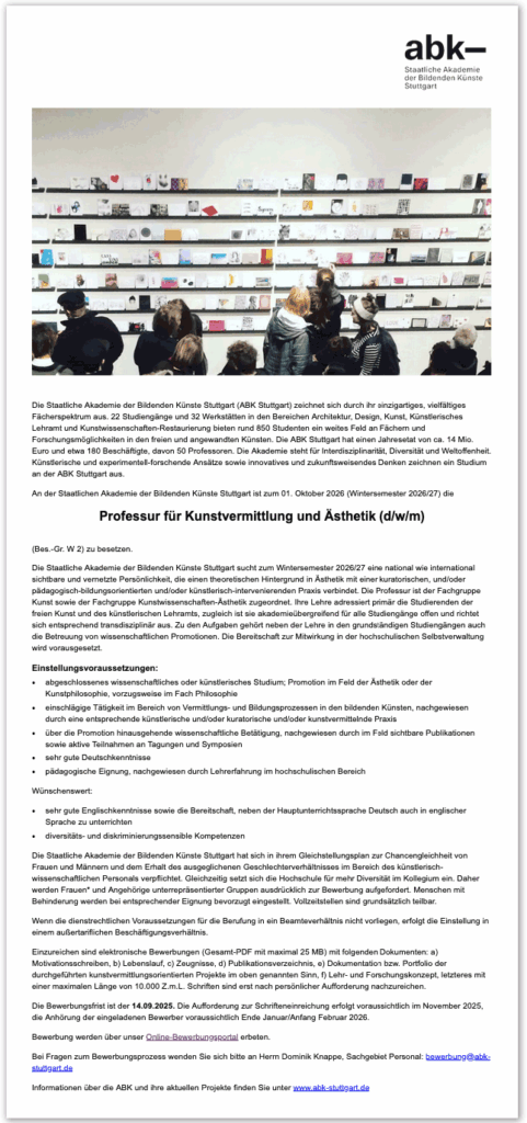 Bewerbung um die Professur für Kunstvermittlung und Ästhetik (W2) ABK Stuttgart – Wintersemester 2026/27